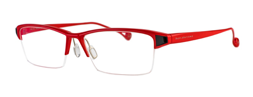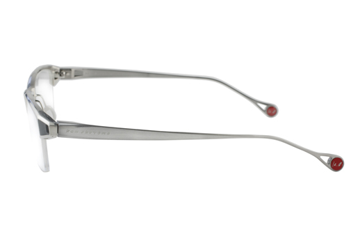 ブリッジの立体造形やフロントサイドからテンプルにかけて繋がる大胆な抜き形状はデザイナーの手掛ける車のディティールをインスパイアしたデザイン。このモデルのディティールを表現できるのは福井県鯖江市の中でも限られた工場であるほど高い技術が要求される。