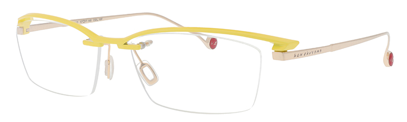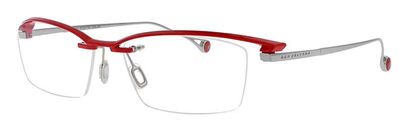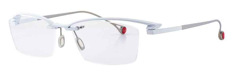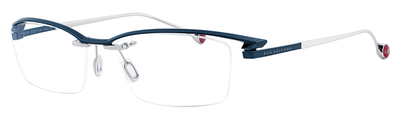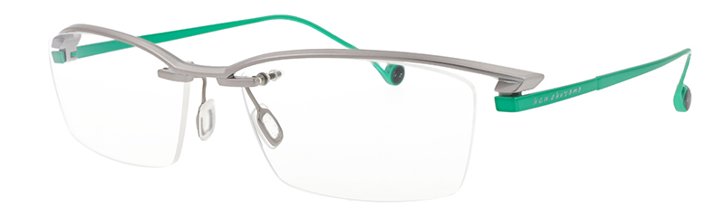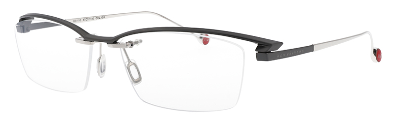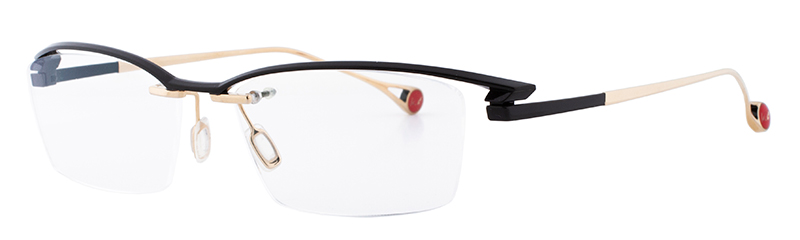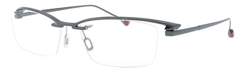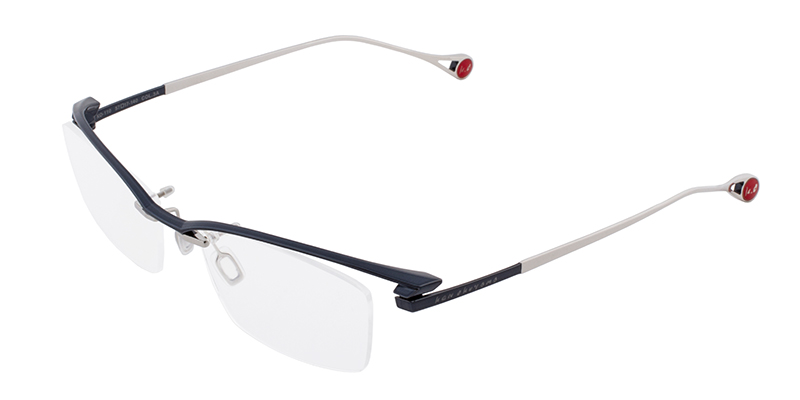 一見シンプルなリムレスモデルだがブローの質感やテンプルへつながるラインはソリッドな立体造形のデザインとなっている。カーデザインを彷彿とさせるフォルムはブランドアイデンティティを感じさせる。