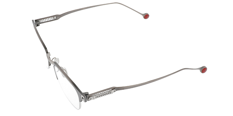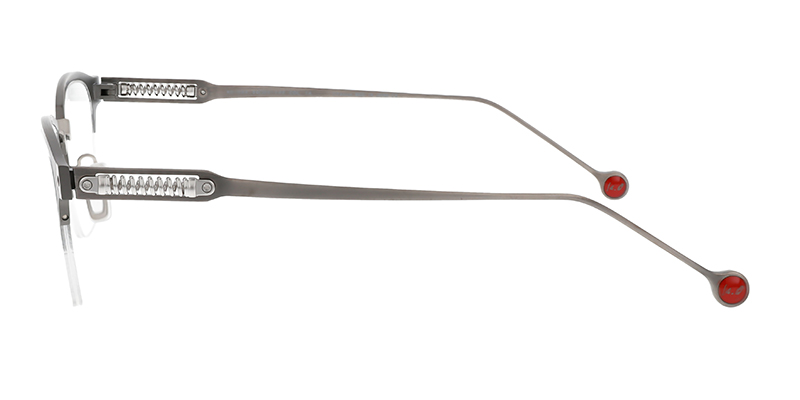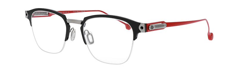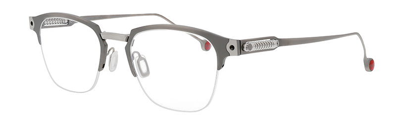 Half-rim style for lightness and comfort. A trend-setting style with motifs typical of car designers.